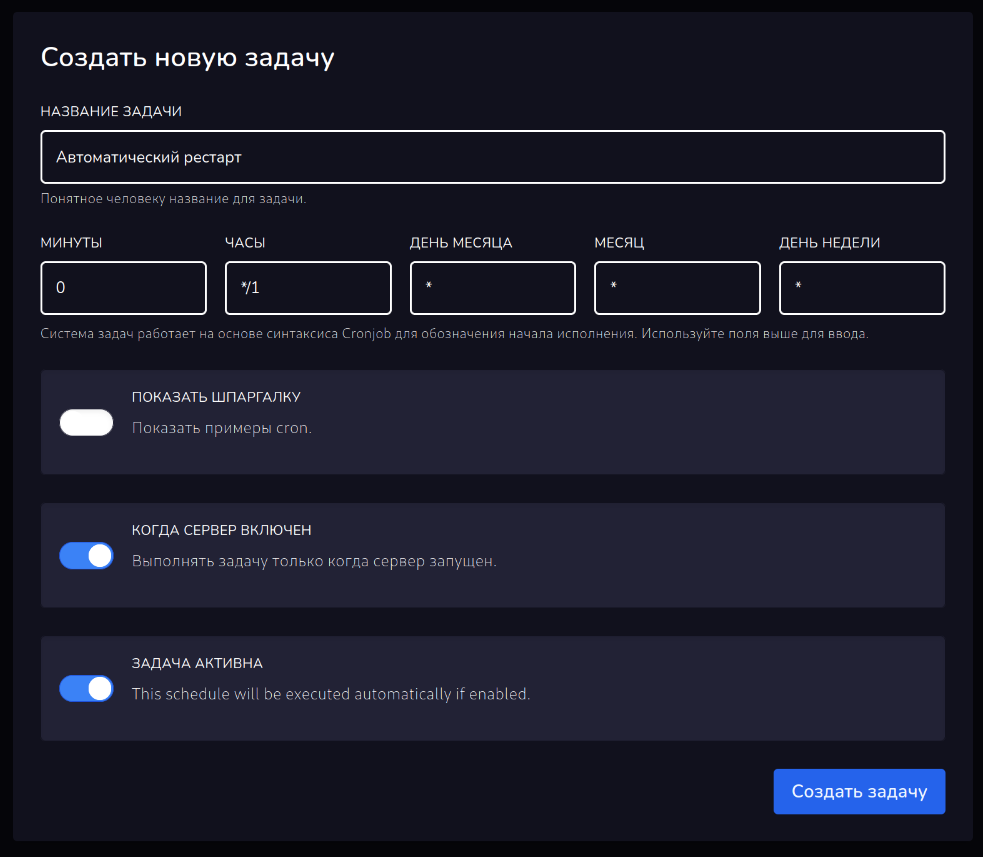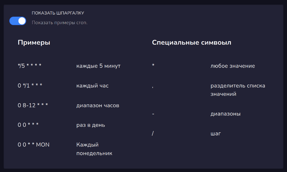 Есть возможность показать шпаргалку, с примерами расписания cron и описанием специальных символов.