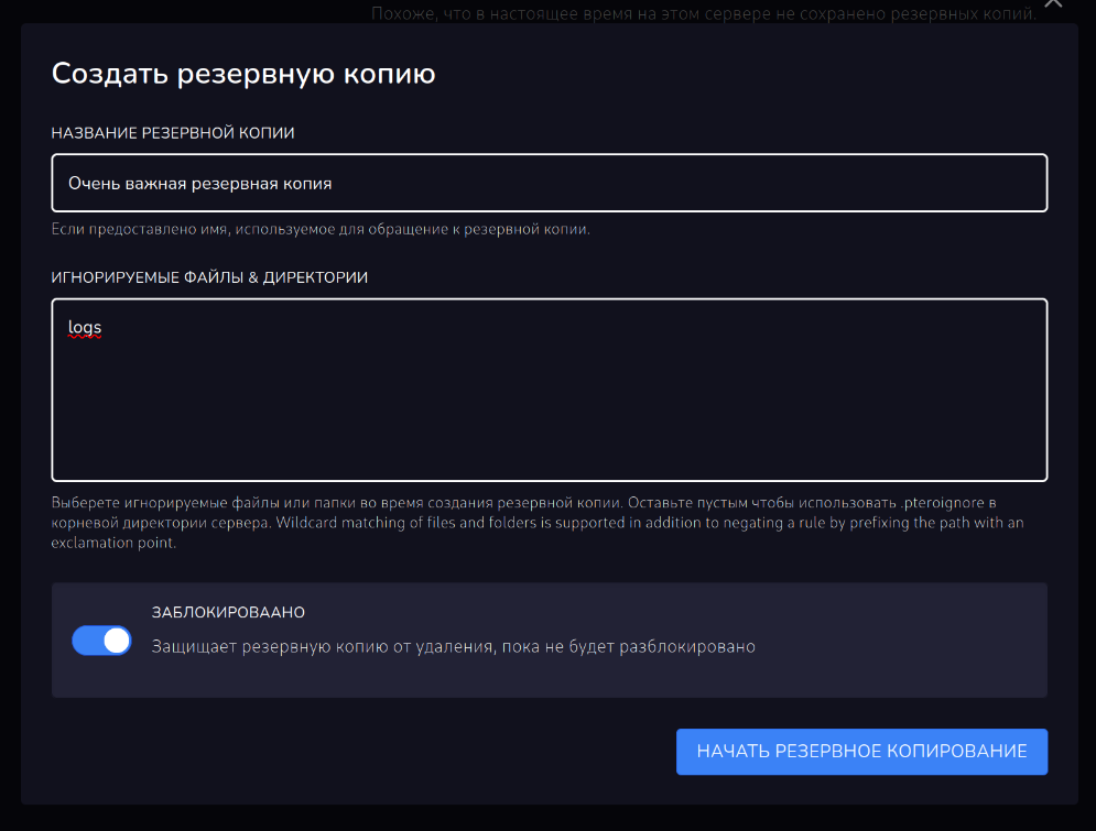 На скриншоте я заблокировал резервную копию, для примера добавил папку logs в исключение резервного копирования.