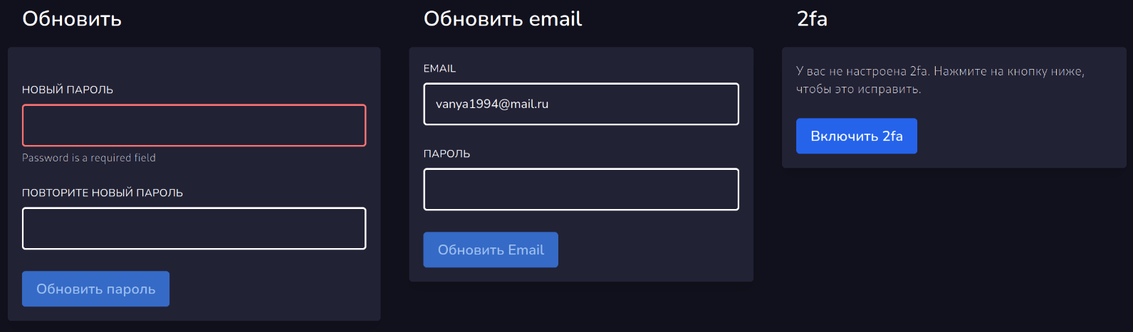 В этом разделе можно обновить пароль, почту и настроить двухфакторную аутентификацию в панели.