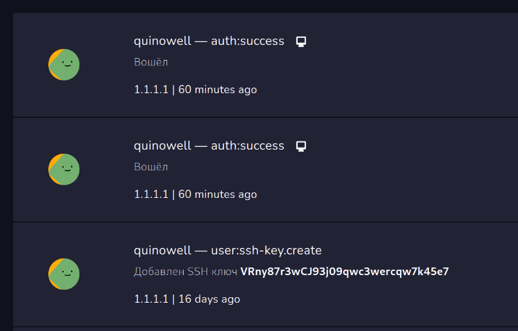 Этот раздел показывает действия с вашим аккаунтом